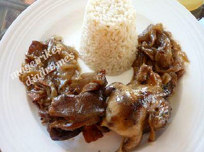 - Σερβίρουμε στο πιάτο το ρύζι τα πουλιά και το κρεμμύδι γαρνιτούρα.