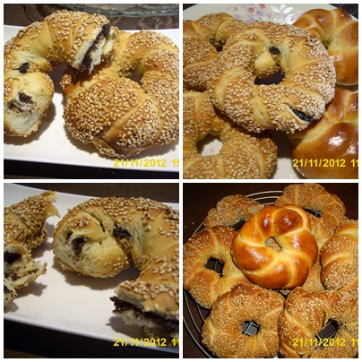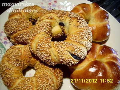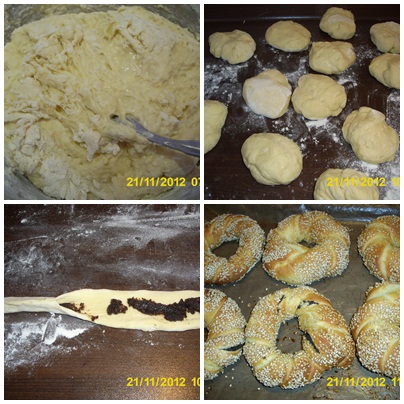 - Παρτε μια μπαλα ζυμης και δουλευοντας πανω σε μια ελαφρως αλευρωμενη επιφανεια εργασιας, σχηματιστε ενα μακρυ κορδονι γυρω στα 70 εκ. Ενωστε τις δυο ακρες του κορδονιου και στριψτε το δημιουργωντας πλεξουδα. Στη συνεχεια σχηματιστε ενα κουλουρι, ενωνοντας τις ακρες, πιεζοντας τες καλα. Τα βουταμε στο πετιμεζι και στο σουσαμι και τα βαζουμε στο ταψι. Τα αφηνουμε να φουσκωσουν για 15 με 20 λεπτα.