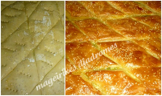- Την αλείφουμε με χτυπημένο αυγό ,την χαράζουμε και πασπαλίζουμε με σουσάμι.