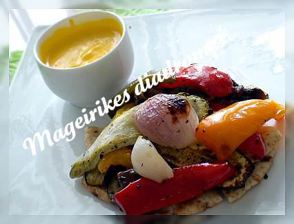 Σερβίρουμε τα λαχανικά πάνω σε ψημένες πίτες από σουβλάκι .