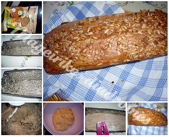 Βουτυρώνουμε και πασπαλίζουμε με ηλιόσπορο μια στενόμακρη φόρμα.