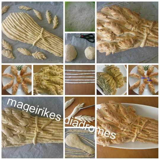 - Ανοίγουμε τα ζυμαράκια που κρατήσαμε σε ρολάκια 4 εκατοστών περίπου, ρολάρουμε τις άκρες τους να σχηματισουν "μυτούλες" ,όπως βλέπετε στις φωτό. Με το ψαλίδι της κουζίνας κάνουμε μικρές ψαλιδιές στα πλάγια να σχηματιστούν τα στάχυα, τα κολλάμε κι αυτά απάνω στις βεργούλες στην κορυφή της βάσης με νερό.