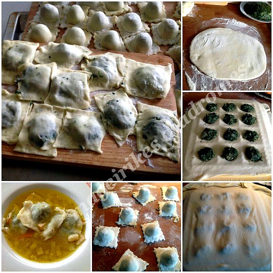 - Ανοίγουμε τη ζύμη σε μια ελαφρώς αλευρωμένη επιφάνεια , πάχους 3 mm περίπου και στη συνέχεια κόβουμε σε τετράγωνα 15 cm, βαζουμε μια κουταλιά της γέμισης αλείφουμε με νερο και μετα το διπλωνουμε πατωντας καλα τις ακρες.