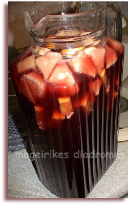 - Προσθέτουμε τα φρούτα σε κυβάκια και βάζουμε για λίγες ώρες στο ψυγείο, να δέσουν οι γεύσεις. Πϊνεται κρύα.