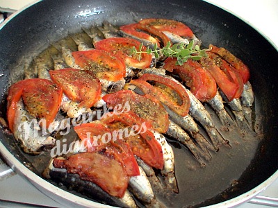 - Πασπαλίζουμε με ρίγανη και τοποθετούμε τις φέτες ντομάτας πάνω στις σαρδέλες. Ρίχνουμε λίγη ρίγανη ακόμα.