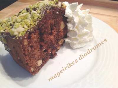 - Ρίξτε τη σοκολάτα πάνω από το κέικ και πασπαλίστε με τους ξηρούς καρπούς