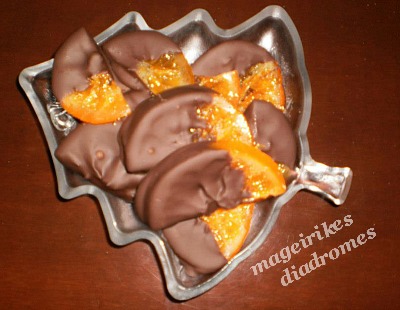 - Τοποθετούμε τις φέτες σε λαδόκολα μέχρι να κρυώσουν. Όταν κρυώσουν τις κόβουμε στη μέση και τις βουτάμε σε λιωμένη κουβερτούρα. Τοποθετούμε σε ταψί με στρωμένη λαδόκολα μέχρι να στερεοποιηθεί η σοκολάτα.