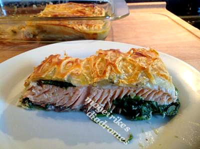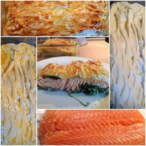 - Ανοιγουμε την μια σφολιατα σε ενα φυλλο ορθογώνιο, βαζουμε επανω το τυρί φέτα, βαζουμε επανω το σπανάκι σχεδον στην μεση , στη συνέχεια, τοποθετήστε επανω το σολομό, το αλάτι και το πιπέρι.