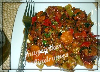- Βάζουμε τα κρεμμύδια και το σκόρδο και τα γυρίζουμε λίγη ώρα ,προσθέτουμε τις πιπεριές και τα καρότα ,συνεχίζοντας το τηγάνισμα.