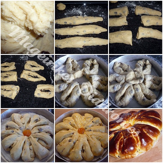 - Τωρα ριχνουμε το λιωμενο βουτυρ ,το ζεστο γαλα με το κρεμ φρες , τα 2 αυγά, το μαχλεπι τον καρδαμο, τη ζάχαρη και αλάτι, ζυμώνουμε ριχνουμε και τις σταφιδες, τα αφήσουμε για 30-45 λεπτά.