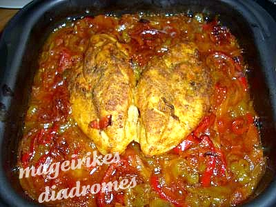 - Βαζουμε το κοτοπουλο απο πανω, το σκεπαζουμε και στον φουρνο! Δεν θέλει ανακάτωμα καθολου! Βάζω και το νερό.