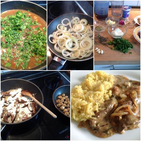 - Εν τω μεταξύ, καθαρίστε τα μανιτάρια, κομμένα σε μικρά κομμάτια και τα τηγανίζουμε σε ένα τηγάνι με λάδι. Όταν τα μανιτάρια παρουν χρωμα, σβηνουμε με λίγο νερό ή λευκό κρασί, προσθετουμε τα μανιτάρια στο Συκωτι