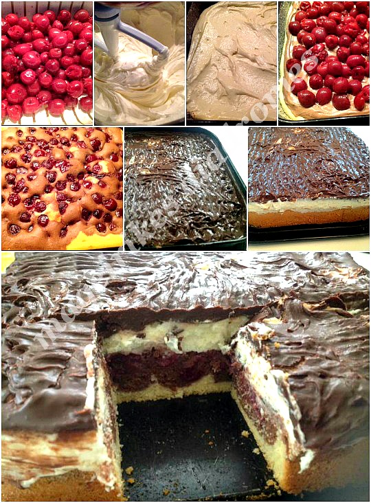 - Βαζουμε το μισό μειγμα μεσα στο ταψι. Στο άλλο μισό, ρίχνουμε το κακαο και το γαλα , την αχνη και τα ανακατεύουμε να ενωθούν Καλα. Το μειγμα αυτο το βαζουμε προσεχτικά επανω στο ασπρο μειγμα που έχουμε βαλει μεσα στο ταψι. Ρίχνουμε επανω τα κεράσια και ψήνουμε για 30 λεπτα. Κανουμε και το τεστ με το ξυλακι, γιατι ο κάθε φούρνος ψήνει διαφορετικά. Οταν ψηθεί, αφηνουμε να κρυωσει Καλα.
