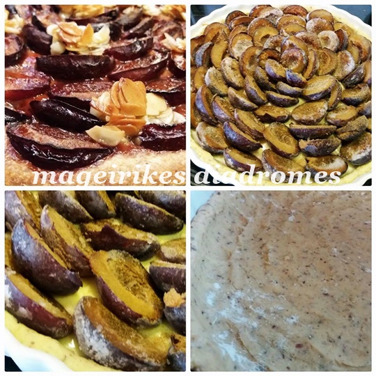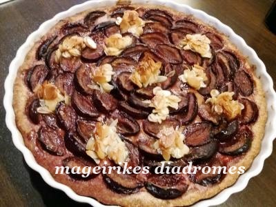 - Βάζω την κρέμα πάνω στην ζύμη και τα δαμάσκηνα ή κεράσια ότι φρούτα θέλω,και πασπαλιζω με λιγη ζάχαρη ή κανέλα.(όποιος θέλει)