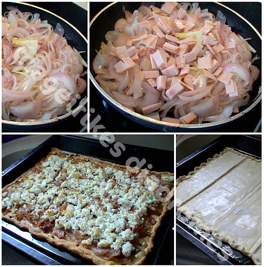 - Στρώνω τα κρεμμύδια πάνω στη σφολιάτα, βάζω πιπέρι και τέλος θρυμματίζω την ξινομυζήθρα.
