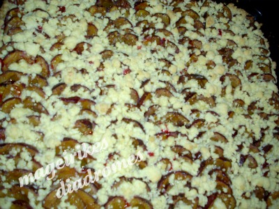 - Φτιάχνουμε το στρόισελ: Το αλεύρι, μπεικιν, ζαχαρη και χλιαρο βούτυρο, πλαθετε με τα χερια καλα και τα τρίβετε με την παλαμη σας και το βάζετε πανω στα δαμασκηνα παντου.