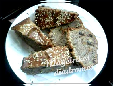 - Βουτυρώνουμε ένα ταψί και πασπαλίζουμε με το σουσάμι .Ρίχνουμε το μείγμα, πασπαλίζουμε ξανά με σουσάμι και ψήνουμε στους 180 βαθμούς για 1\2 ώρα περίπου.