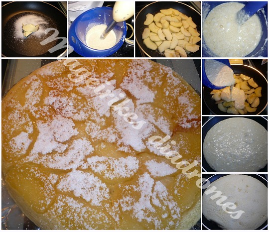 - Ξεφλουδίστε τα μήλα και κόψτε τα σε φέτες. Βαζουμε το βούτυρο και τη ζάχαρη σε ενα τηγάνι , ριχνουμε και τα μηλα να καραμελώνουν ελαφρώς. προσθετουμε το Calvados και ρίχνουμε πάνω τη ζύμη.