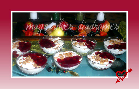 Ρίχνουμε το σιρόπι, βάζουμε πάλι κεράσια, γιαούρτι ,2 σπασμένα Ferrero Ciotto, σιρόπι