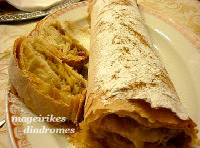 - Απλώνουμε μια λαδόκολα και επάνω της βάζουμε το πρώτο φύλο,βουτυρώνουμε και πασπαλίζουμε λίγη ζάχαρη. Συνεχίζουμε έτσι και με τα υπόλοιπα φύλλα. Απλώνουμε την γέμιση κατά μήκος του φύλου και διπλώνουμε από το πλάι σαν φάκελο .Αρχίζουμε να τυλίγουμε το ρολό μας και βάζουμε από την κάτω πλευρά το ένωμα.Το μεταφέρουμε σε ταψί μαζί με την λαδόκολα και το αλοίφουμε καλά με βούτυρο.