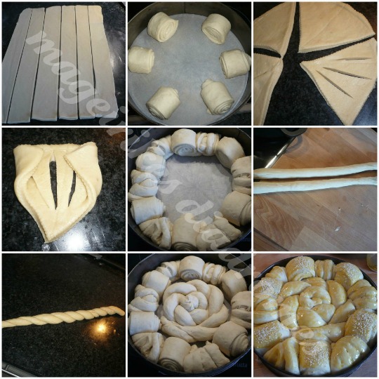 - Ανοιγω το ενα μερος απο τη ζυμη σε 24Χ34 ποντους και κοβουμε 6 λωριδες τη μια σε 4 εκατοστα τις τυλιγουμε μια μια σε ενα μικρο ρολλο και τις βαζουμε στην φορμα βλεπετε φωτο. Ανοιγουμε ενα φυλλο στη διαμετρο της φορμας και το κοβουμε σε 6 τριγωνα κοματια. Χαραζουμε 3 - 4 φορες το φυλλο αλλα οχι να κοπει μεχρι κατω. Τυλιγουμε το φυλο σαν κρουασαν και το βαζουμε αναμεσα στα ρολακια.