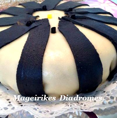 - Καλυπτουμε την τουρτα ολοκληρη με ενα φυλλο απο αμυγδαλοπαστα, παιρνουμε λιγη απο την αμυγδαλοπαστα και την βαφουμε στο χρωμα που θελουμε, κοβουμε λωριδες και βαζουμε γυρω γυρω επανω στην τουρτα.