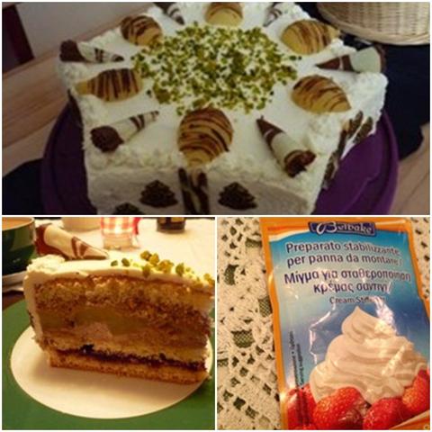 - Χτυπαμε την Κρεμα γαλακτος με την βανίλια και τη σταθεροποιητή σκονη σε σαντιγη, βαζουμε λιγη μεσα σε μια σακουλα κορνε για να την στολισουμε και με την υπολοιπη κρεμα αλείφουμε την τουρτα μας απο πανω και τα πλαγια.