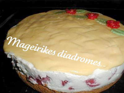 - Ξαναβάζουμε το παντεσπάνι στην φόρμα , ρίχνουμε επάνω την κρέμα του γιαουρτιού το βάζουμε στο ψυγείο για 2 ώρες .