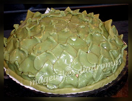 Εγώ δεν έβαλα από πάνω το γλασο σοκολάτας, αλλά την στόλισα με την αμυγδαλοπαστα σε σχέδιο αγκινάρας.