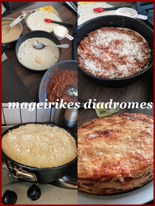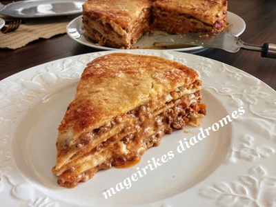 - Το ίδιο επαναλαμβάνω και στις επόμενες στρώσεις, στο τέλος βάζω την τελευταία πίτα, μπεσαμέλ και τυρί. Και έχουμε 6 πίτες 5 στρώσεις μπεσαμέλ- κιμά - τυριού, φροντίζουμε να ισομερίσουμε τις ποσότητες, κρατώντας και μπεσαμέλ με τυρί για το τέλος.