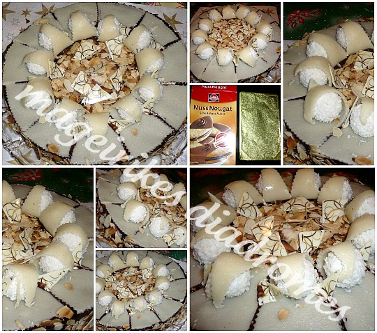 - Βάζουμε τόν έναν καί αλείφουμε μέ τήν κρέμα καί βάζουμε τόν δεύτερο καί συνεχίζουμε μέ κρέμα καί τόν τρίτο ρίχνουμε από πάνω τό λιωμένο Μαντολάτο (Νουγκά) κα'ι τά καβουρντισμένα φουντούκια ή αμύγδαλα