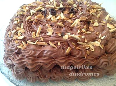 - Μετα χτυπαμε το garni οπως λέει η συσκευασία και γαρνίρουμε την τουρτα μας. Πασπαλιζουμε με λίγα καβουρντισμένα αμυγδαλα. Βαζουμε την τουρτα μας στο ψυγείο.