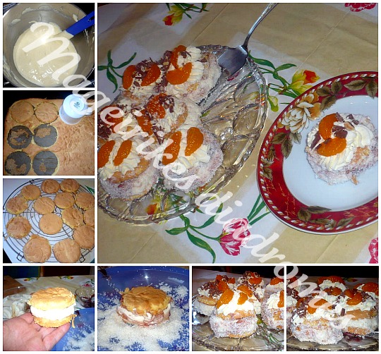 - Παίρνουμε μετα ενα κομμάτι απο το κομμενο παντεσπανι, βαζουμε επανω κρεμα και σκεπαζουμε με ενα αλλο κομματι παντεσπανι, το αλείφουμε γυρω γυρω με μαρμελαδα και πασπαλιζουμε τά πλάγια καλά με την καρυδα