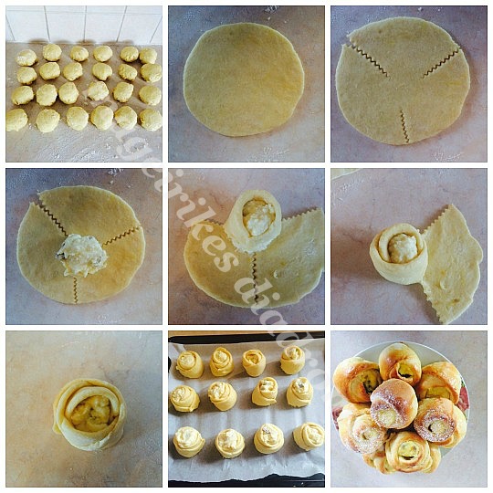 - Ανοίγουμε, κόβουμε σε 3, βαζουνε στη μεση τη γεμιση κ τυλιγουμε όπως σας έδειξα, πρώτα να πιάσει η πρωτη λωρίδα, μετα δεύτερη και στο τελος η Τριτη.