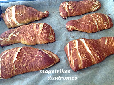 - Ξανά το διπλώνουμε, αναμεσα ξανά άλειμμα με βουτυρο και ξανά άνοιγμα σε μέγεθος Μεγαλου πιάτου κοβουμε σε 8 τριγωνα.