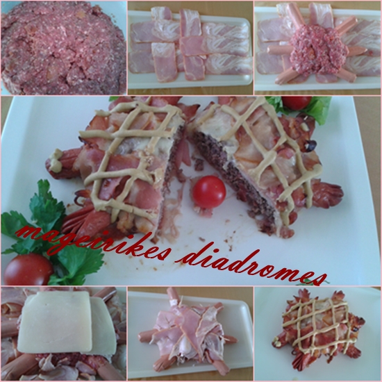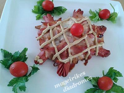 - Πιάνουμε τις λωρίδες του μπέικον και καλύπτουμε όλο το μπιφτέκι. Στερεώνουμε με οδοντογλυφίδες πόδια, ουρά, κεφάλι, σκεπάζουμε με αλουμινόχαρτο και ψήνουμε στο γκριλ της κουζίνας μας 40-45 λεπτά. Τα τελευταία 10 λεπτά αφαιρούμε το αλουμινόχαρτο να ροδίσουν. Διακοσμούμε με μουστάρδα ή κέτσαπ και σερβίρουμε με σαλάτα εποχής.