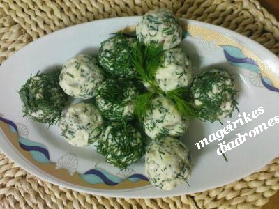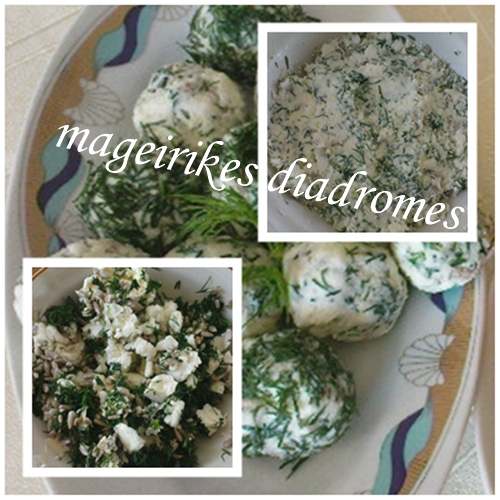 - Παίρνουμε μείγμα και πλάθουμε μικρές μπαλίτσες τυριού. Τις μισές τις κυλάμε στον υπόλοιπο άνηθο να καλυφθούν ή σε ηλιόσπορους,αφήνουμε και κάποιες λευκές.