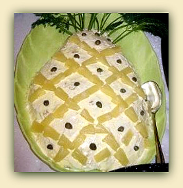 - Σε μια πιατέλα τοποθετούμε όλη τη σαλάτα και της δίνουμε το σχήμα του ανανά .