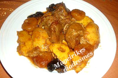 - Μουσκεύουμε από βραδύς τα βερίκοκα και τα δαμάσκηνα στο κρασί. Πλένουμε το κρέας και το σκουπίζουμε καλά. Στραγγίζουμε τα φρούτα από το κρασί. Καθαρίζουμε τα κυδώνια από το χνούδι και τα πλένουμε, τα κόβουμε κομμάτια και αφαιρούμε τα κουκούτσια,όχι την φλούδα και τα βάζουμε σε νερό με χυμό λεμονιού να μην μαυρίσουν.