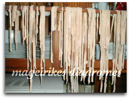 Τα χειροποίητα ζυμαρικά είναι άλλο πράγμα σε νοσστιμιά!!!!Πολύ καλός ο τρόπος στεγνώματος!!!!Εγώ τα βάζω σε δίσκους ή ταψάκια τα αλευρώνω και τα αφήνω να στεγνώσουν,τώρα το καλοκαίρι δεν θέλουν πολύ ώρα!!!30' αρκούν!!