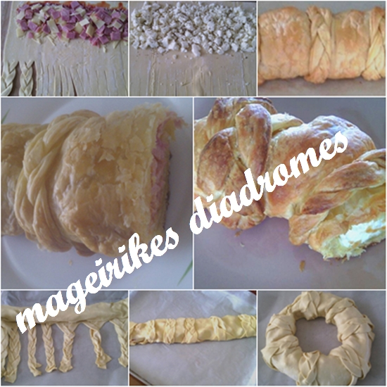- Βάζουμε στο υπόλοιπο φύλλο τη γέμιση ,ζαμπόν-τυρί-κέτσαπ για την ζαμπονοτυρόπιτα Ή τυρί-ρίγανη για την τυρόπιτα. Τυλίγουμε σφιχτό ρολό τη γέμιση ,πλέκουμε τις λωρίδες και τις τυλίγουμε γύρω από το ρολό σφολιάτας.