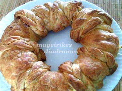 - Βάζουμε σε ταψί με λαδόκολλα και Ή τα αφήνουμε ρολό όπως είναι Ή ενώνουμε τις δύο άκρες του σχηματίζοντας στεφανάκι. Περνάμε με λάδι ή γάλα το φύλλο και ψήνουμε στους 180ο για 30 λεπτά να ροδίσει.